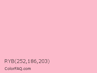 RYB 252,186,203 Color is a very light red color and the nearest color is Pink #ffc0cb. Hex code #fcbacb and RGB value is rgb(252,186,203). In RGB color space, this color is composed of 99% red, 73% green, 80% blue, In CMYK color space, this color is composed of 0% cyan, 26% magenta, 19% yellow , 1% black , In HSL color space, this color has a hue angle of 345° , 92% saturation and 86% lightness.