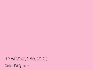 RYB 252,186,210 Color is a very light rose color and the nearest color is Cotton Candy #ffb7d5. Hex code #fcbad2 and RGB value is rgb(252,186,210). In RGB color space, this color is composed of 99% red, 73% green, 82% blue, In CMYK color space, this color is composed of 0% cyan, 26% magenta, 17% yellow , 1% black , In HSL color space, this color has a hue angle of 338° , 92% saturation and 86% lightness.