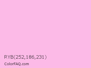 RYB 252,186,231 Color is a very light magenta color and the nearest color is Light Hot Pink #ffb3de. Hex code #fcbae7 and RGB value is rgb(252,186,231). In RGB color space, this color is composed of 99% red, 73% green, 91% blue, In CMYK color space, this color is composed of 0% cyan, 26% magenta, 8% yellow , 1% black , In HSL color space, this color has a hue angle of 319° , 92% saturation and 86% lightness.