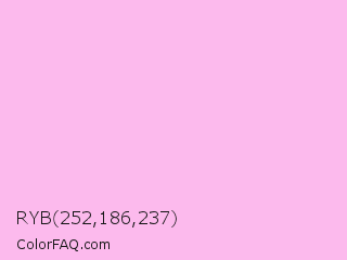 RYB 252,186,237 Color is a very light magenta color and the nearest color is Light Hot Pink #ffb3de. Hex code #fcbaed and RGB value is rgb(252,186,237). In RGB color space, this color is composed of 99% red, 73% green, 93% blue, In CMYK color space, this color is composed of 0% cyan, 26% magenta, 6% yellow , 1% black , In HSL color space, this color has a hue angle of 314° , 92% saturation and 86% lightness.