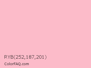 RYB 252,187,201 Color is a very light red color and the nearest color is Pink #ffc0cb. Hex code #fcbbc9 and RGB value is rgb(252,187,201). In RGB color space, this color is composed of 99% red, 73% green, 79% blue, In CMYK color space, this color is composed of 0% cyan, 26% magenta, 20% yellow , 1% black , In HSL color space, this color has a hue angle of 347° , 92% saturation and 86% lightness.