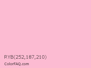 RYB 252,187,210 Color is a very light rose color and the nearest color is Cotton Candy #ffb7d5. Hex code #fcbbd2 and RGB value is rgb(252,187,210). In RGB color space, this color is composed of 99% red, 73% green, 82% blue, In CMYK color space, this color is composed of 0% cyan, 26% magenta, 17% yellow , 1% black , In HSL color space, this color has a hue angle of 339° , 92% saturation and 86% lightness.