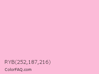RYB 252,187,216 Color is a very light rose color and the nearest color is Cotton Candy #ffbcd9. Hex code #fcbbd8 and RGB value is rgb(252,187,216). In RGB color space, this color is composed of 99% red, 73% green, 85% blue, In CMYK color space, this color is composed of 0% cyan, 26% magenta, 14% yellow , 1% black , In HSL color space, this color has a hue angle of 333° , 92% saturation and 86% lightness.
