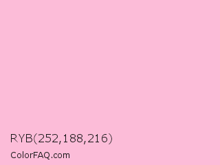 RYB 252,188,216 Color is a very light rose color and the nearest color is Cupid #fbbeda. Hex code #fcbcd8 and RGB value is rgb(252,188,216). In RGB color space, this color is composed of 99% red, 74% green, 85% blue, In CMYK color space, this color is composed of 0% cyan, 25% magenta, 14% yellow , 1% black , In HSL color space, this color has a hue angle of 334° , 91% saturation and 86% lightness.