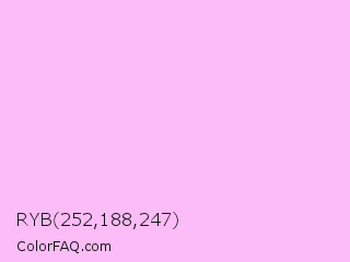 RYB 252,188,247 Color is a very light magenta color and the nearest color is Electric Lavender #f4bbff. Hex code #fcbcf7 and RGB value is rgb(252,188,247). In RGB color space, this color is composed of 99% red, 74% green, 97% blue, In CMYK color space, this color is composed of 0% cyan, 25% magenta, 2% yellow , 1% black , In HSL color space, this color has a hue angle of 305° , 91% saturation and 86% lightness.