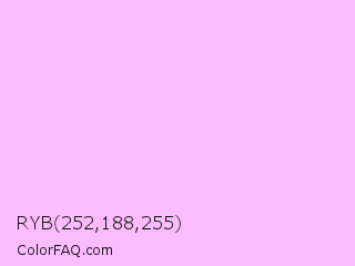 RYB 252,188,255 Color is a very light magenta color and the nearest color is Electric Lavender #f4bbff. Hex code #fcbcff and RGB value is rgb(252,188,255). In RGB color space, this color is composed of 99% red, 74% green, 100% blue, In CMYK color space, this color is composed of 1% cyan, 26% magenta, 0% yellow , 0% black , In HSL color space, this color has a hue angle of 297° , 100% saturation and 87% lightness.