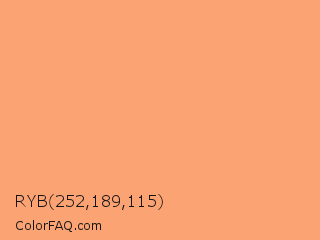 RYB 252,189,115 Color is a light orange color and the nearest color is Light Salmon #ffa07a. Hex code #fca373 and RGB value is rgb(252,163,115). In RGB color space, this color is composed of 99% red, 64% green, 45% blue, In CMYK color space, this color is composed of 0% cyan, 35% magenta, 54% yellow , 1% black , In HSL color space, this color has a hue angle of 21° , 96% saturation and 72% lightness.