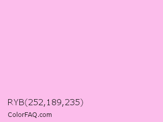 RYB 252,189,235 Color is a very light magenta color and the nearest color is Chantilly #f8c3df. Hex code #fcbdeb and RGB value is rgb(252,189,235). In RGB color space, this color is composed of 99% red, 74% green, 92% blue, In CMYK color space, this color is composed of 0% cyan, 25% magenta, 7% yellow , 1% black , In HSL color space, this color has a hue angle of 316° , 91% saturation and 86% lightness.