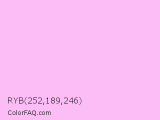 RYB 252,189,246 Color is a very light magenta color and the nearest color is Electric Lavender #f4bbff. Hex code #fcbdf6 and RGB value is rgb(252,189,246). In RGB color space, this color is composed of 99% red, 74% green, 96% blue, In CMYK color space, this color is composed of 0% cyan, 25% magenta, 2% yellow , 1% black , In HSL color space, this color has a hue angle of 306° , 91% saturation and 86% lightness.