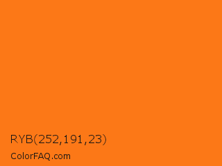 RYB 252,191,23 Color is a normal orange color and the nearest color is Ecstasy #fa7814. Hex code #fc7817 and RGB value is rgb(252,120,23). In RGB color space, this color is composed of 99% red, 47% green, 9% blue, In CMYK color space, this color is composed of 0% cyan, 52% magenta, 91% yellow , 1% black , In HSL color space, this color has a hue angle of 25° , 97% saturation and 54% lightness.