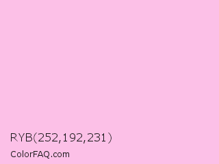 RYB 252,192,231 Color is a very light magenta color and the nearest color is Chantilly #f8c3df. Hex code #fcc0e7 and RGB value is rgb(252,192,231). In RGB color space, this color is composed of 99% red, 75% green, 91% blue, In CMYK color space, this color is composed of 0% cyan, 24% magenta, 8% yellow , 1% black , In HSL color space, this color has a hue angle of 321° , 91% saturation and 87% lightness.