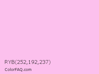 RYB 252,192,237 Color is a very light magenta color and the nearest color is Classic Rose #fbcce7. Hex code #fcc0ed and RGB value is rgb(252,192,237). In RGB color space, this color is composed of 99% red, 75% green, 93% blue, In CMYK color space, this color is composed of 0% cyan, 24% magenta, 6% yellow , 1% black , In HSL color space, this color has a hue angle of 315° , 91% saturation and 87% lightness.