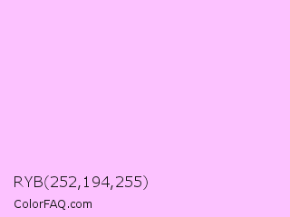 RYB 252,194,255 Color is a very light magenta color and the nearest color is Electric Lavender #f4bbff. Hex code #fcc2ff and RGB value is rgb(252,194,255). In RGB color space, this color is composed of 99% red, 76% green, 100% blue, In CMYK color space, this color is composed of 1% cyan, 24% magenta, 0% yellow , 0% black , In HSL color space, this color has a hue angle of 297° , 100% saturation and 88% lightness.