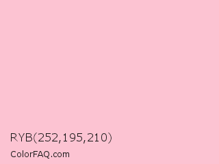 RYB 252,195,210 Color is a very light rose color and the nearest color is Bubble Gum #ffc1cc. Hex code #fcc3d2 and RGB value is rgb(252,195,210). In RGB color space, this color is composed of 99% red, 76% green, 82% blue, In CMYK color space, this color is composed of 0% cyan, 23% magenta, 17% yellow , 1% black , In HSL color space, this color has a hue angle of 344° , 90% saturation and 88% lightness.