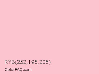 RYB 252,196,206 Color is a very light red color and the nearest color is Bubble Gum #ffc1cc. Hex code #fcc4ce and RGB value is rgb(252,196,206). In RGB color space, this color is composed of 99% red, 77% green, 81% blue, In CMYK color space, this color is composed of 0% cyan, 22% magenta, 18% yellow , 1% black , In HSL color space, this color has a hue angle of 349° , 90% saturation and 88% lightness.