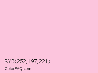 RYB 252,197,221 Color is a very light rose color and the nearest color is Chantilly #f8c3df. Hex code #fcc5dd and RGB value is rgb(252,197,221). In RGB color space, this color is composed of 99% red, 77% green, 87% blue, In CMYK color space, this color is composed of 0% cyan, 22% magenta, 12% yellow , 1% black , In HSL color space, this color has a hue angle of 334° , 90% saturation and 88% lightness.