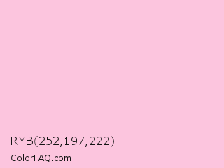 RYB 252,197,222 Color is a very light rose color and the nearest color is Chantilly #f8c3df. Hex code #fcc5de and RGB value is rgb(252,197,222). In RGB color space, this color is composed of 99% red, 77% green, 87% blue, In CMYK color space, this color is composed of 0% cyan, 22% magenta, 12% yellow , 1% black , In HSL color space, this color has a hue angle of 333° , 90% saturation and 88% lightness.