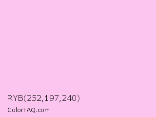RYB 252,197,240 Color is a very light magenta color and the nearest color is Shampoo #ffcff1. Hex code #fcc5f0 and RGB value is rgb(252,197,240). In RGB color space, this color is composed of 99% red, 77% green, 94% blue, In CMYK color space, this color is composed of 0% cyan, 22% magenta, 5% yellow , 1% black , In HSL color space, this color has a hue angle of 313° , 90% saturation and 88% lightness.