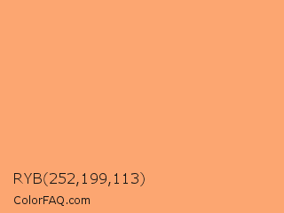 RYB 252,199,113 Color is a light orange color and the nearest color is Light Salmon #ffa07a. Hex code #fca671 and RGB value is rgb(252,166,113). In RGB color space, this color is composed of 99% red, 65% green, 44% blue, In CMYK color space, this color is composed of 0% cyan, 34% magenta, 55% yellow , 1% black , In HSL color space, this color has a hue angle of 23° , 96% saturation and 72% lightness.