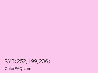 RYB 252,199,236 Color is a very light magenta color and the nearest color is Classic Rose #fbcce7. Hex code #fcc7ec and RGB value is rgb(252,199,236). In RGB color space, this color is composed of 99% red, 78% green, 93% blue, In CMYK color space, this color is composed of 0% cyan, 21% magenta, 6% yellow , 1% black , In HSL color space, this color has a hue angle of 318° , 90% saturation and 88% lightness.