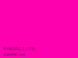 RYB 252,1,173 Color is a normal magenta color and the nearest color is Hollywood Cerise #f400a1. Hex code #fc01ad and RGB value is rgb(252,1,173). In RGB color space, this color is composed of 99% red, 0% green, 68% blue, In CMYK color space, this color is composed of 0% cyan, 100% magenta, 31% yellow , 1% black , In HSL color space, this color has a hue angle of 319° , 99% saturation and 50% lightness.