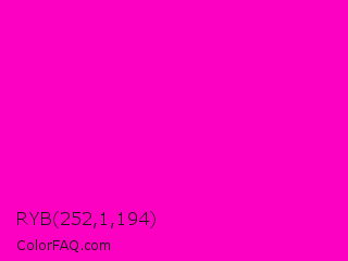 RYB 252,1,194 Color is a normal magenta color and the nearest color is Purple Pizzazz #ff00cc. Hex code #fc01c2 and RGB value is rgb(252,1,194). In RGB color space, this color is composed of 99% red, 0% green, 76% blue, In CMYK color space, this color is composed of 0% cyan, 100% magenta, 23% yellow , 1% black , In HSL color space, this color has a hue angle of 314° , 99% saturation and 50% lightness.