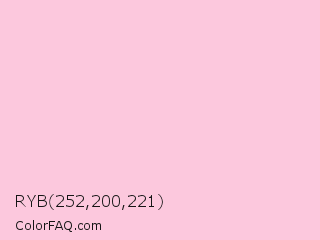 RYB 252,200,221 Color is a very light rose color and the nearest color is Azalea #f7c8da. Hex code #fcc8dd and RGB value is rgb(252,200,221). In RGB color space, this color is composed of 99% red, 78% green, 87% blue, In CMYK color space, this color is composed of 0% cyan, 21% magenta, 12% yellow , 1% black , In HSL color space, this color has a hue angle of 336° , 90% saturation and 89% lightness.