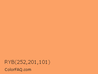 RYB 252,201,101 Color is a light orange color and the nearest color is Atomic Tangerine #ff9966. Hex code #fca165 and RGB value is rgb(252,161,101). In RGB color space, this color is composed of 99% red, 63% green, 40% blue, In CMYK color space, this color is composed of 0% cyan, 36% magenta, 60% yellow , 1% black , In HSL color space, this color has a hue angle of 24° , 96% saturation and 69% lightness.