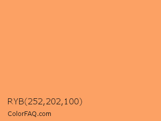 RYB 252,202,100 Color is a light orange color and the nearest color is Atomic Tangerine #ff9966. Hex code #fca164 and RGB value is rgb(252,161,100). In RGB color space, this color is composed of 99% red, 63% green, 39% blue, In CMYK color space, this color is composed of 0% cyan, 36% magenta, 60% yellow , 1% black , In HSL color space, this color has a hue angle of 24° , 96% saturation and 69% lightness.