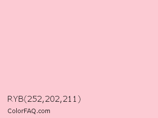 RYB 252,202,211 Color is a very light red color and the nearest color is Azalea #f7c8da. Hex code #fccad3 and RGB value is rgb(252,202,211). In RGB color space, this color is composed of 99% red, 79% green, 83% blue, In CMYK color space, this color is composed of 0% cyan, 20% magenta, 16% yellow , 1% black , In HSL color space, this color has a hue angle of 349° , 89% saturation and 89% lightness.