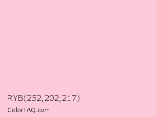 RYB 252,202,217 Color is a very light rose color and the nearest color is Azalea #f7c8da. Hex code #fccad9 and RGB value is rgb(252,202,217). In RGB color space, this color is composed of 99% red, 79% green, 85% blue, In CMYK color space, this color is composed of 0% cyan, 20% magenta, 14% yellow , 1% black , In HSL color space, this color has a hue angle of 342° , 89% saturation and 89% lightness.