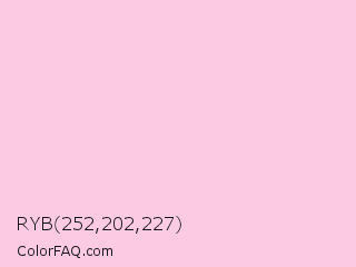 RYB 252,202,227 Color is a very light rose color and the nearest color is Classic Rose #fbcce7. Hex code #fccae3 and RGB value is rgb(252,202,227). In RGB color space, this color is composed of 99% red, 79% green, 89% blue, In CMYK color space, this color is composed of 0% cyan, 20% magenta, 10% yellow , 1% black , In HSL color space, this color has a hue angle of 330° , 89% saturation and 89% lightness.