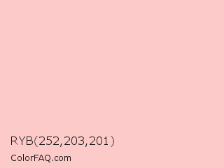 RYB 252,203,201 Color is a very light red color and the nearest color is Bubble Gum #ffc1cc. Hex code #fccbc9 and RGB value is rgb(252,203,201). In RGB color space, this color is composed of 99% red, 80% green, 79% blue, In CMYK color space, this color is composed of 0% cyan, 19% magenta, 20% yellow , 1% black , In HSL color space, this color has a hue angle of 2° , 89% saturation and 89% lightness.