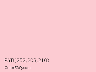 RYB 252,203,210 Color is a very light red color and the nearest color is Azalea #f7c8da. Hex code #fccbd2 and RGB value is rgb(252,203,210). In RGB color space, this color is composed of 99% red, 80% green, 82% blue, In CMYK color space, this color is composed of 0% cyan, 19% magenta, 17% yellow , 1% black , In HSL color space, this color has a hue angle of 351° , 89% saturation and 89% lightness.