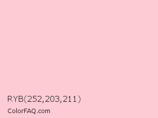 RYB 252,203,211 Color is a very light red color and the nearest color is Azalea #f7c8da. Hex code #fccbd3 and RGB value is rgb(252,203,211). In RGB color space, this color is composed of 99% red, 80% green, 83% blue, In CMYK color space, this color is composed of 0% cyan, 19% magenta, 16% yellow , 1% black , In HSL color space, this color has a hue angle of 350° , 89% saturation and 89% lightness.