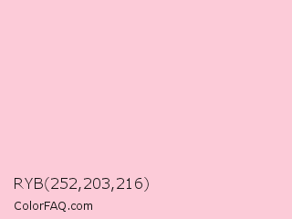 RYB 252,203,216 Color is a very light rose color and the nearest color is Azalea #f7c8da. Hex code #fccbd8 and RGB value is rgb(252,203,216). In RGB color space, this color is composed of 99% red, 80% green, 85% blue, In CMYK color space, this color is composed of 0% cyan, 19% magenta, 14% yellow , 1% black , In HSL color space, this color has a hue angle of 344° , 89% saturation and 89% lightness.