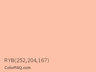 RYB 252,204,167 Color is a very light orange color and the nearest color is Wax Flower #ffc0a8. Hex code #fcc1a7 and RGB value is rgb(252,193,167). In RGB color space, this color is composed of 99% red, 76% green, 65% blue, In CMYK color space, this color is composed of 0% cyan, 23% magenta, 34% yellow , 1% black , In HSL color space, this color has a hue angle of 18° , 93% saturation and 82% lightness.