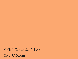 RYB 252,205,112 Color is a light orange color and the nearest color is Very Light Tangelo #ffb077. Hex code #fca870 and RGB value is rgb(252,168,112). In RGB color space, this color is composed of 99% red, 66% green, 44% blue, In CMYK color space, this color is composed of 0% cyan, 33% magenta, 56% yellow , 1% black , In HSL color space, this color has a hue angle of 24° , 96% saturation and 71% lightness.