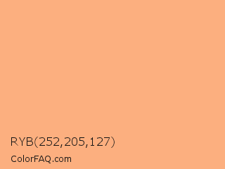 RYB 252,205,127 Color is a light orange color and the nearest color is Hit Pink #ffab81. Hex code #fcaf7f and RGB value is rgb(252,175,127). In RGB color space, this color is composed of 99% red, 69% green, 50% blue, In CMYK color space, this color is composed of 0% cyan, 31% magenta, 50% yellow , 1% black , In HSL color space, this color has a hue angle of 23° , 95% saturation and 74% lightness.