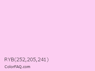 RYB 252,205,241 Color is a very light magenta color and the nearest color is Shampoo #ffcff1. Hex code #fccdf1 and RGB value is rgb(252,205,241). In RGB color space, this color is composed of 99% red, 80% green, 95% blue, In CMYK color space, this color is composed of 0% cyan, 19% magenta, 4% yellow , 1% black , In HSL color space, this color has a hue angle of 314° , 89% saturation and 90% lightness.