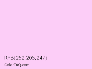 RYB 252,205,247 Color is a very light magenta color and the nearest color is Shampoo #ffcff1. Hex code #fccdf7 and RGB value is rgb(252,205,247). In RGB color space, this color is composed of 99% red, 80% green, 97% blue, In CMYK color space, this color is composed of 0% cyan, 19% magenta, 2% yellow , 1% black , In HSL color space, this color has a hue angle of 306° , 89% saturation and 90% lightness.