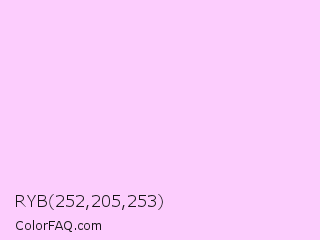 RYB 252,205,253 Color is a very light magenta color and the nearest color is Shampoo #ffcff1. Hex code #fccdfd and RGB value is rgb(252,205,253). In RGB color space, this color is composed of 99% red, 80% green, 99% blue, In CMYK color space, this color is composed of 0% cyan, 19% magenta, 0% yellow , 1% black , In HSL color space, this color has a hue angle of 299° , 92% saturation and 90% lightness.