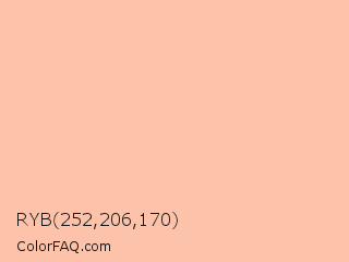 RYB 252,206,170 Color is a very light orange color and the nearest color is Wax Flower #ffc0a8. Hex code #fcc3aa and RGB value is rgb(252,195,170). In RGB color space, this color is composed of 99% red, 76% green, 67% blue, In CMYK color space, this color is composed of 0% cyan, 23% magenta, 33% yellow , 1% black , In HSL color space, this color has a hue angle of 18° , 93% saturation and 83% lightness.