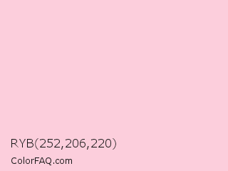 RYB 252,206,220 Color is a very light rose color and the nearest color is Pastel Pink #ffd1dc. Hex code #fccedc and RGB value is rgb(252,206,220). In RGB color space, this color is composed of 99% red, 81% green, 86% blue, In CMYK color space, this color is composed of 0% cyan, 18% magenta, 13% yellow , 1% black , In HSL color space, this color has a hue angle of 342° , 88% saturation and 90% lightness.
