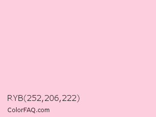 RYB 252,206,222 Color is a very light rose color and the nearest color is Pastel Pink #ffd1dc. Hex code #fccede and RGB value is rgb(252,206,222). In RGB color space, this color is composed of 99% red, 81% green, 87% blue, In CMYK color space, this color is composed of 0% cyan, 18% magenta, 12% yellow , 1% black , In HSL color space, this color has a hue angle of 339° , 88% saturation and 90% lightness.