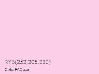 RYB 252,206,232 Color is a very light magenta color and the nearest color is Classic Rose #fbcce7. Hex code #fccee8 and RGB value is rgb(252,206,232). In RGB color space, this color is composed of 99% red, 81% green, 91% blue, In CMYK color space, this color is composed of 0% cyan, 18% magenta, 8% yellow , 1% black , In HSL color space, this color has a hue angle of 326° , 88% saturation and 90% lightness.