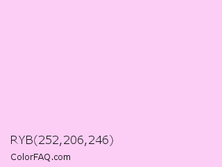 RYB 252,206,246 Color is a very light magenta color and the nearest color is Shampoo #ffcff1. Hex code #fccef6 and RGB value is rgb(252,206,246). In RGB color space, this color is composed of 99% red, 81% green, 96% blue, In CMYK color space, this color is composed of 0% cyan, 18% magenta, 2% yellow , 1% black , In HSL color space, this color has a hue angle of 308° , 88% saturation and 90% lightness.