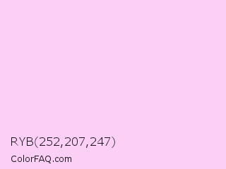 RYB 252,207,247 Color is a very light magenta color and the nearest color is Shampoo #ffcff1. Hex code #fccff7 and RGB value is rgb(252,207,247). In RGB color space, this color is composed of 99% red, 81% green, 97% blue, In CMYK color space, this color is composed of 0% cyan, 18% magenta, 2% yellow , 1% black , In HSL color space, this color has a hue angle of 307° , 88% saturation and 90% lightness.