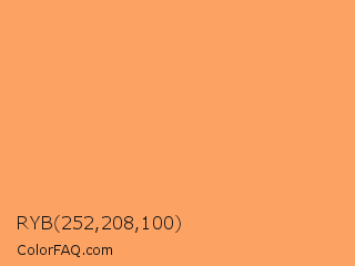 RYB 252,208,100 Color is a light orange color and the nearest color is Rajah #fbab60. Hex code #fca364 and RGB value is rgb(252,163,100). In RGB color space, this color is composed of 99% red, 64% green, 39% blue, In CMYK color space, this color is composed of 0% cyan, 35% magenta, 60% yellow , 1% black , In HSL color space, this color has a hue angle of 25° , 96% saturation and 69% lightness.