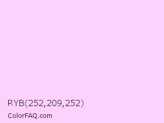RYB 252,209,252 Color is a very light magenta color and the nearest color is Shampoo #ffcff1. Hex code #fcd1fc and RGB value is rgb(252,209,252). In RGB color space, this color is composed of 99% red, 82% green, 99% blue, In CMYK color space, this color is composed of 0% cyan, 17% magenta, 0% yellow , 1% black , In HSL color space, this color has a hue angle of 300° , 88% saturation and 90% lightness.